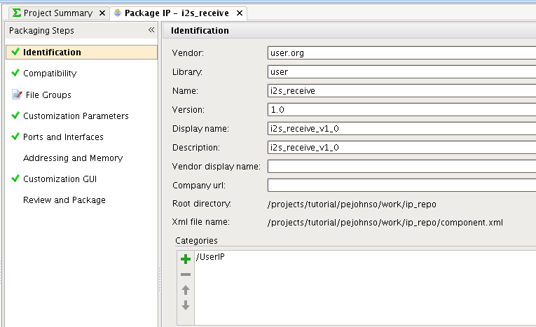 Go to the Tools menu and select Create and Package New IP. Click Next, make sure the Package your current project option is selected, then click Next again. Select a location for your IP repository and click Next. You should use the same location when creating both the I2S transmitter and receive packages. A dialog box will appear, asking for you to Confirm Copy Sources. This lets you know that the source files for the IP will be copied to the IP repository. Go ahead and click OK.